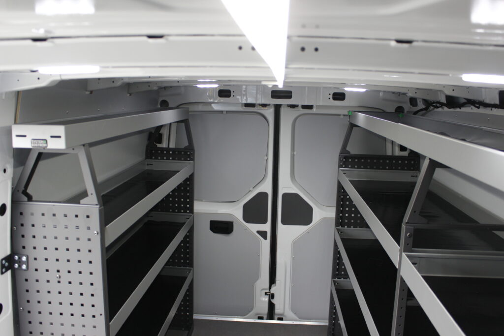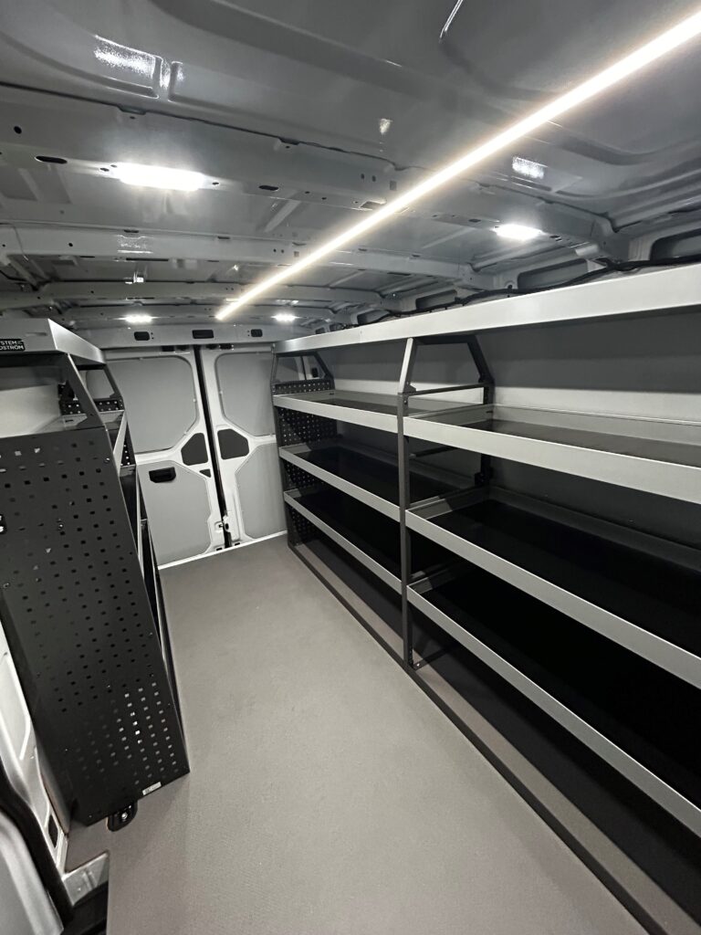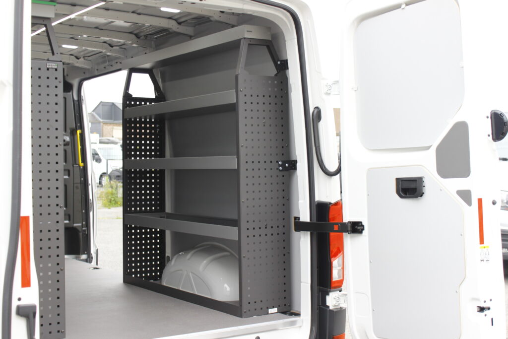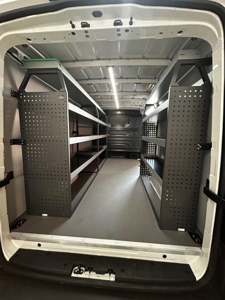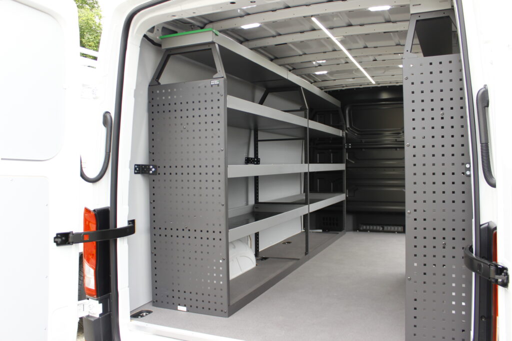 Aménagement de 2 VW Crafter pour les Ets Lombet composé d’une galerie de toit avec rives ouvertes, étagères intérieures et éclairage renforcé de la zone de chargement.