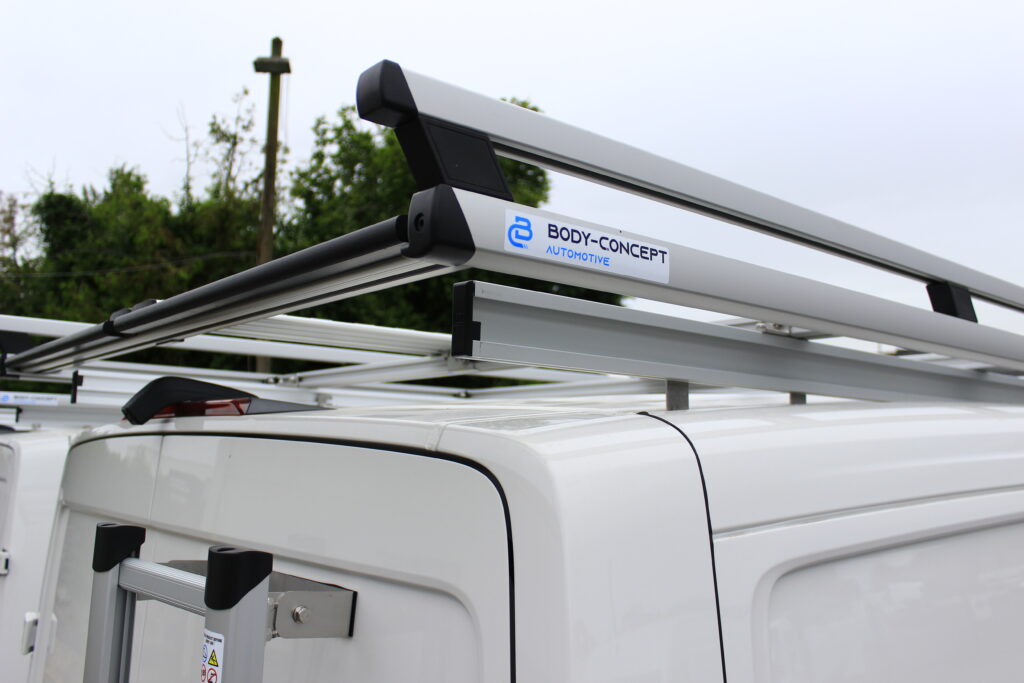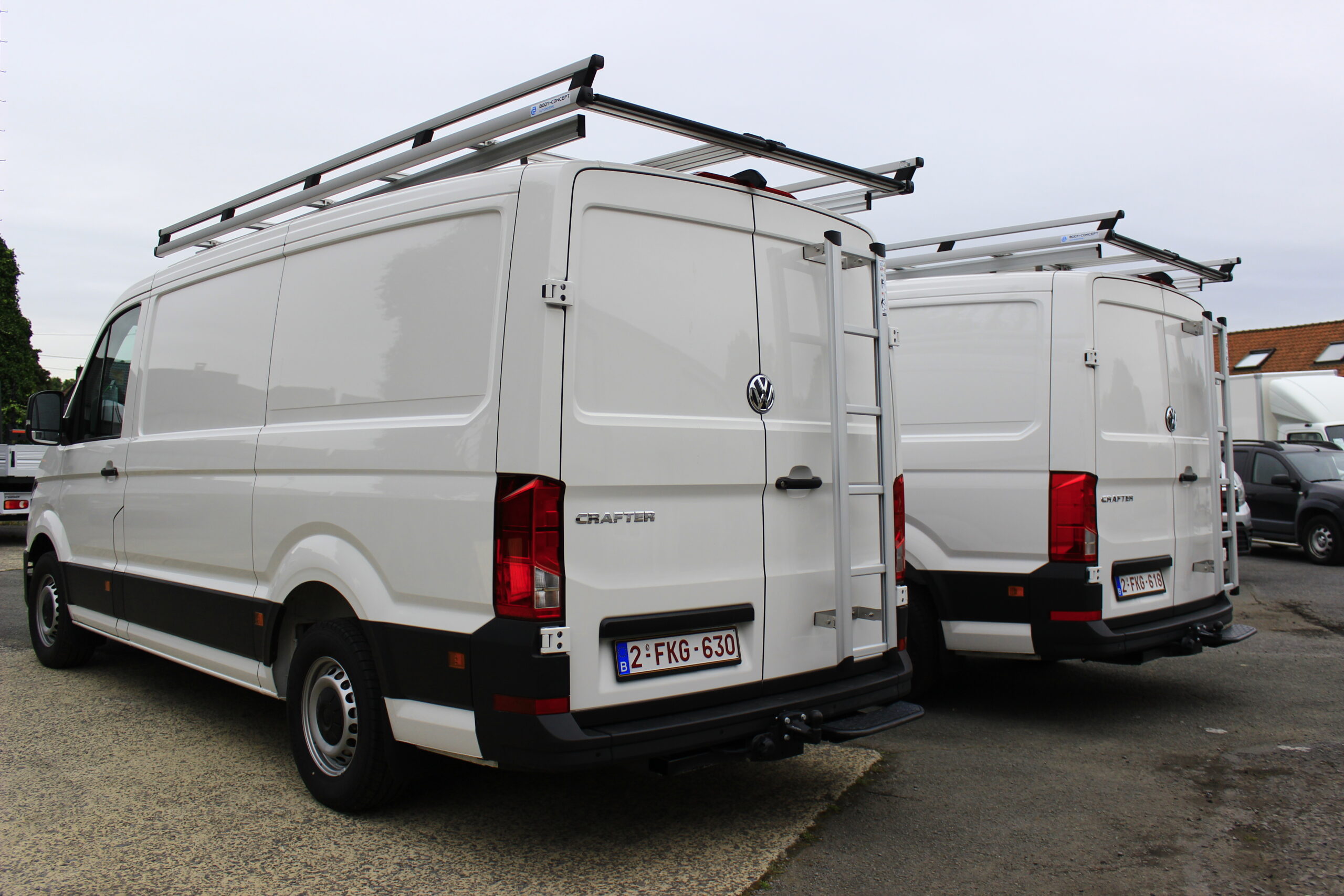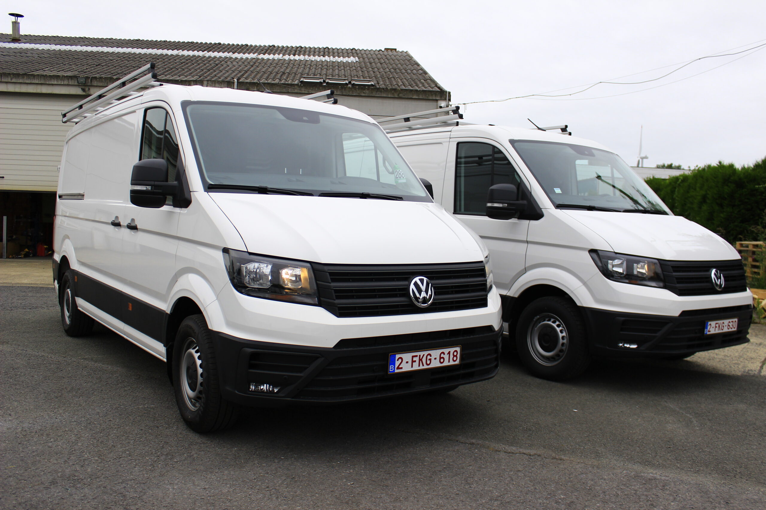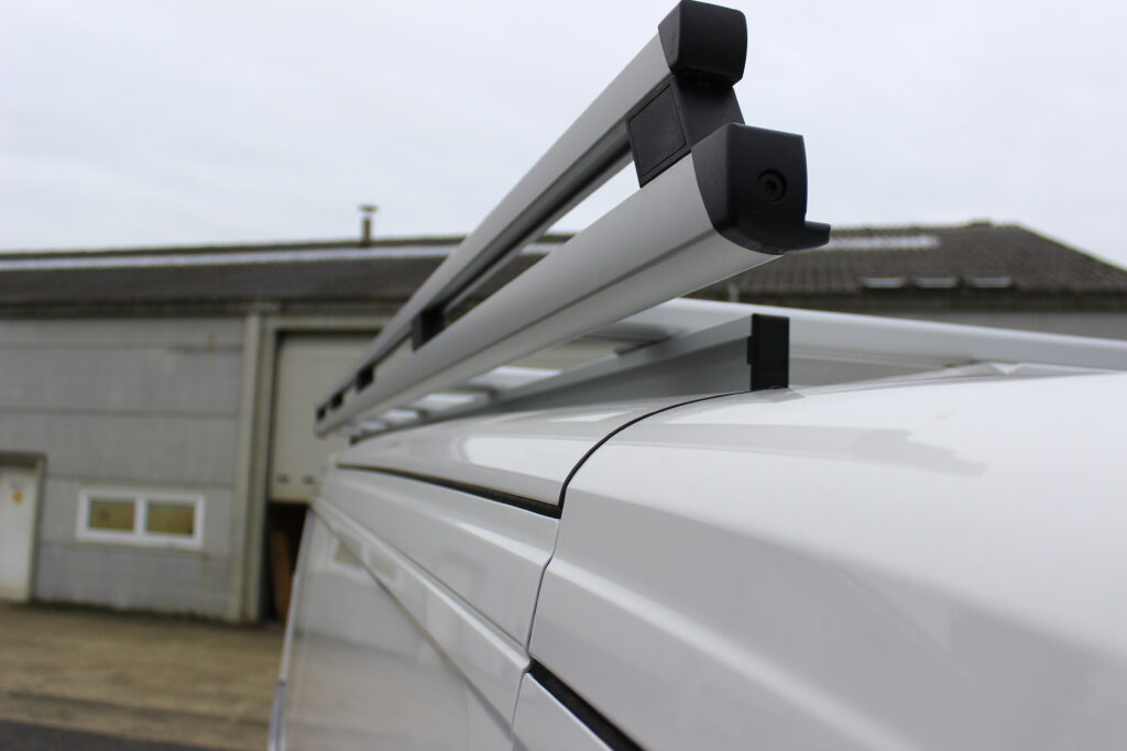 Aménagement de 2 VW Crafter pour les Ets Lombet composé d’une galerie de toit avec rives ouvertes, étagères intérieures et éclairage renforcé de la zone de chargement.