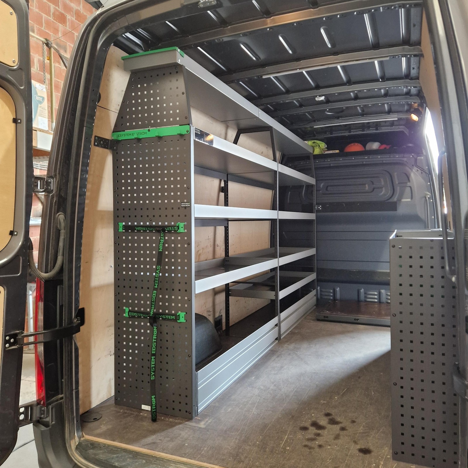 Aménagement complet d’un Mercedes Sprinter : mobilier System Edström, bacs, parois perforées et plateau coulissant 300 kg pour générateur.