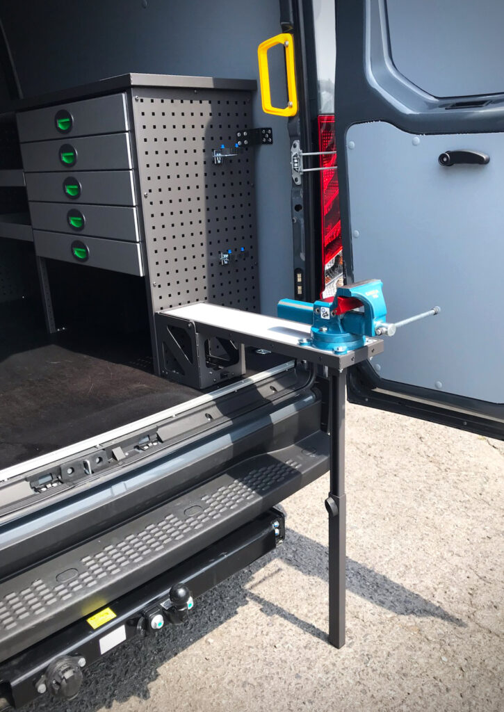 L’établi dépliable constitue l’un des éléments clés de cet aménagement. Équipé d’un étau robuste, il permet aux professionnels de :
