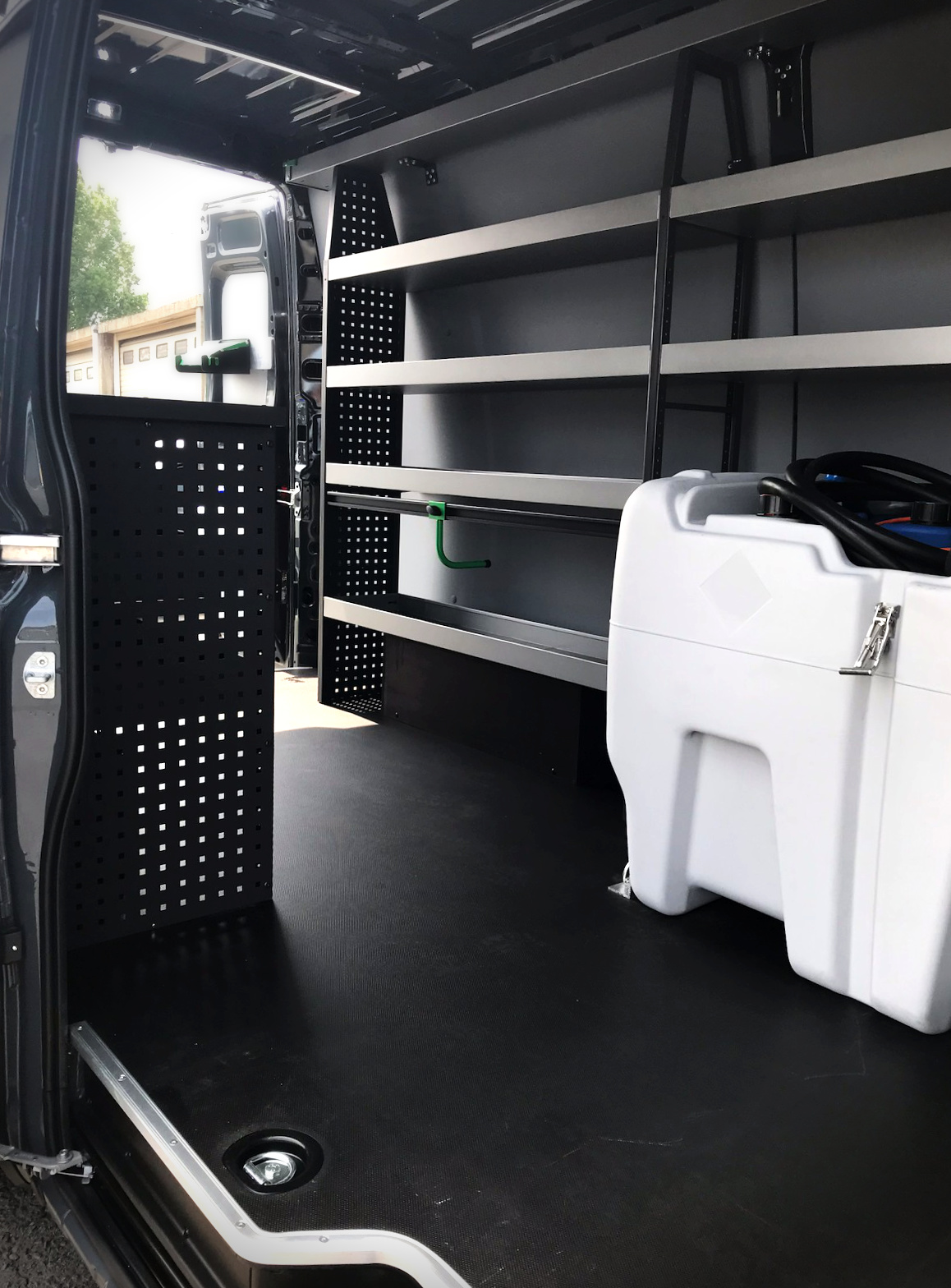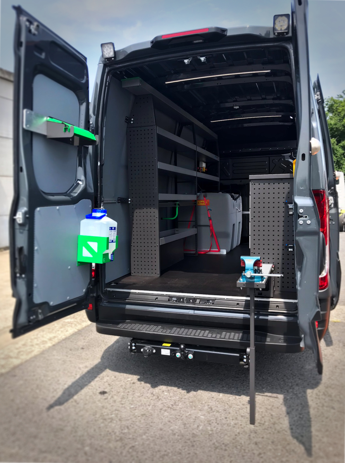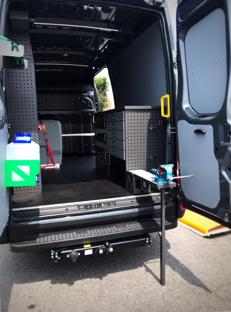 Aménagement complet d’un Iveco Daily 2023 en véhicule atelier professionnel avec établi dépliable équipé d’un étau, cuve personnalisable (mazout ou Ad Blue au choix) et 2 prises électriques 230V pour batteries d’outils. Solution sur mesure Body-Concept pour autonomie et efficacité maximales.