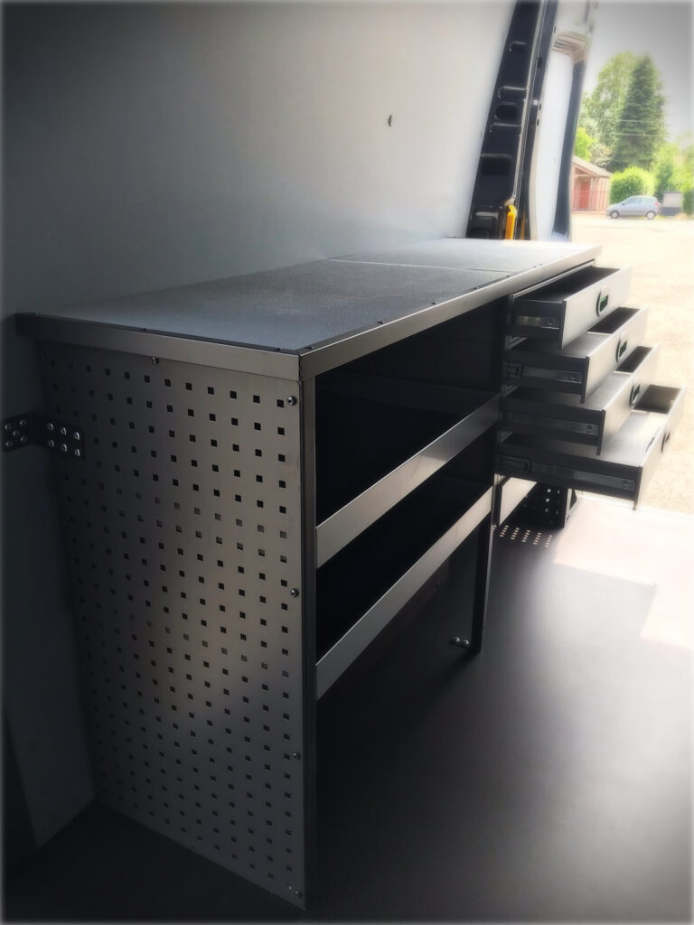 L’aménagement de ce véhicule atelier a été conçu pour offrir aux artisans et techniciens itinérants un espace de travail complet et fonctionnel, comparable à un atelier fixe.