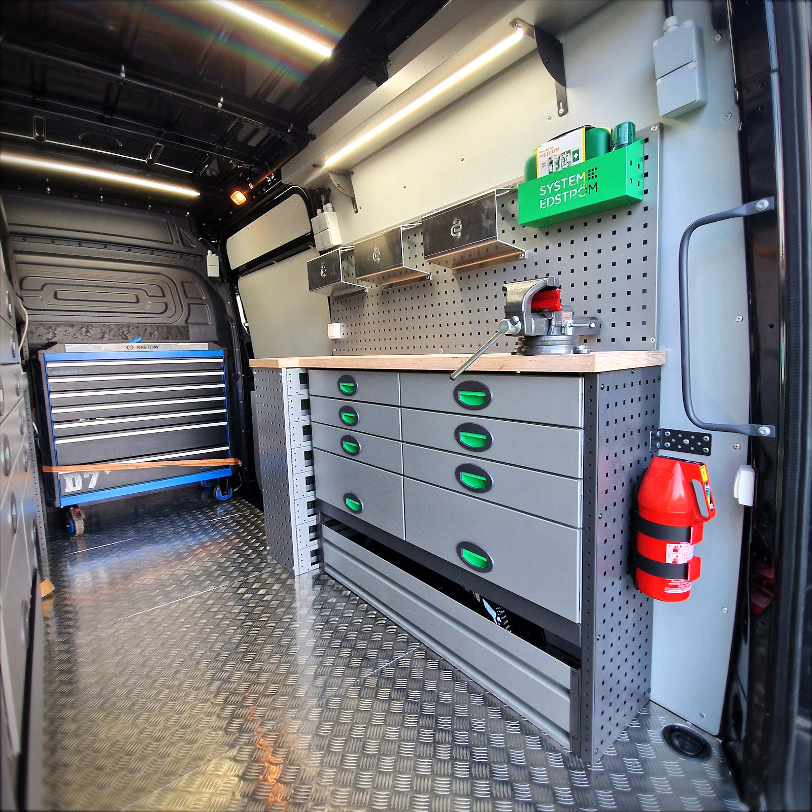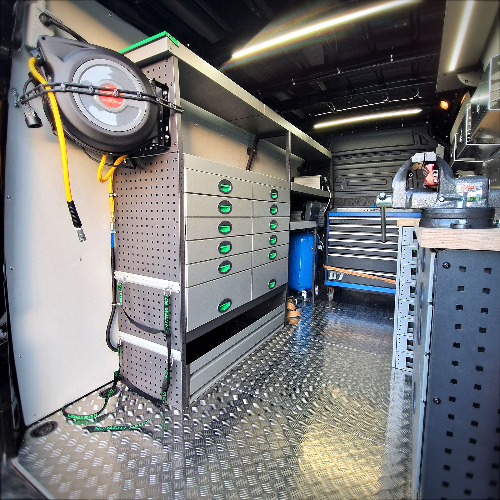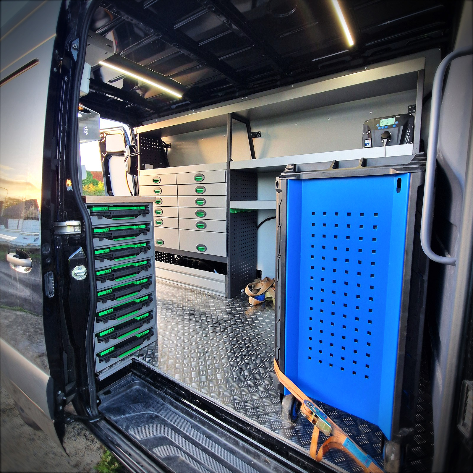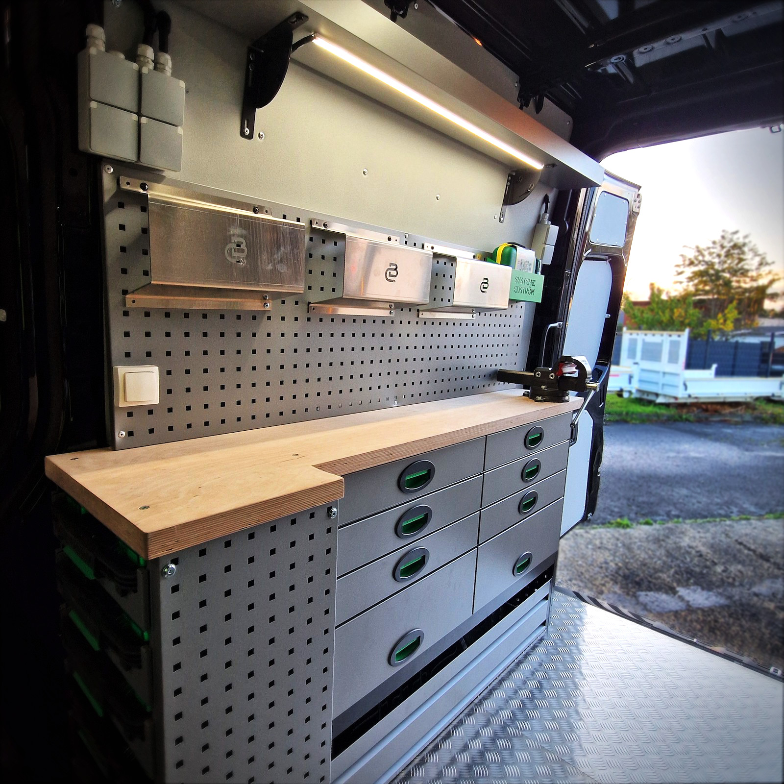 Le Mercedes Sprinter a été équipé d’un établi avec étau robuste, d’une armoire à valisette, ainsi que de deux télécommandes Clayton distinctes : une en cabine et une autre dans la partie chargement, pour un contrôle optimal de l’aménagement. Cet établi permet une organisation efficace et fonctionnelle de l’espace de travail. Quatre prises 230V ont également été intégrées pour alimenter divers outils électriques.
