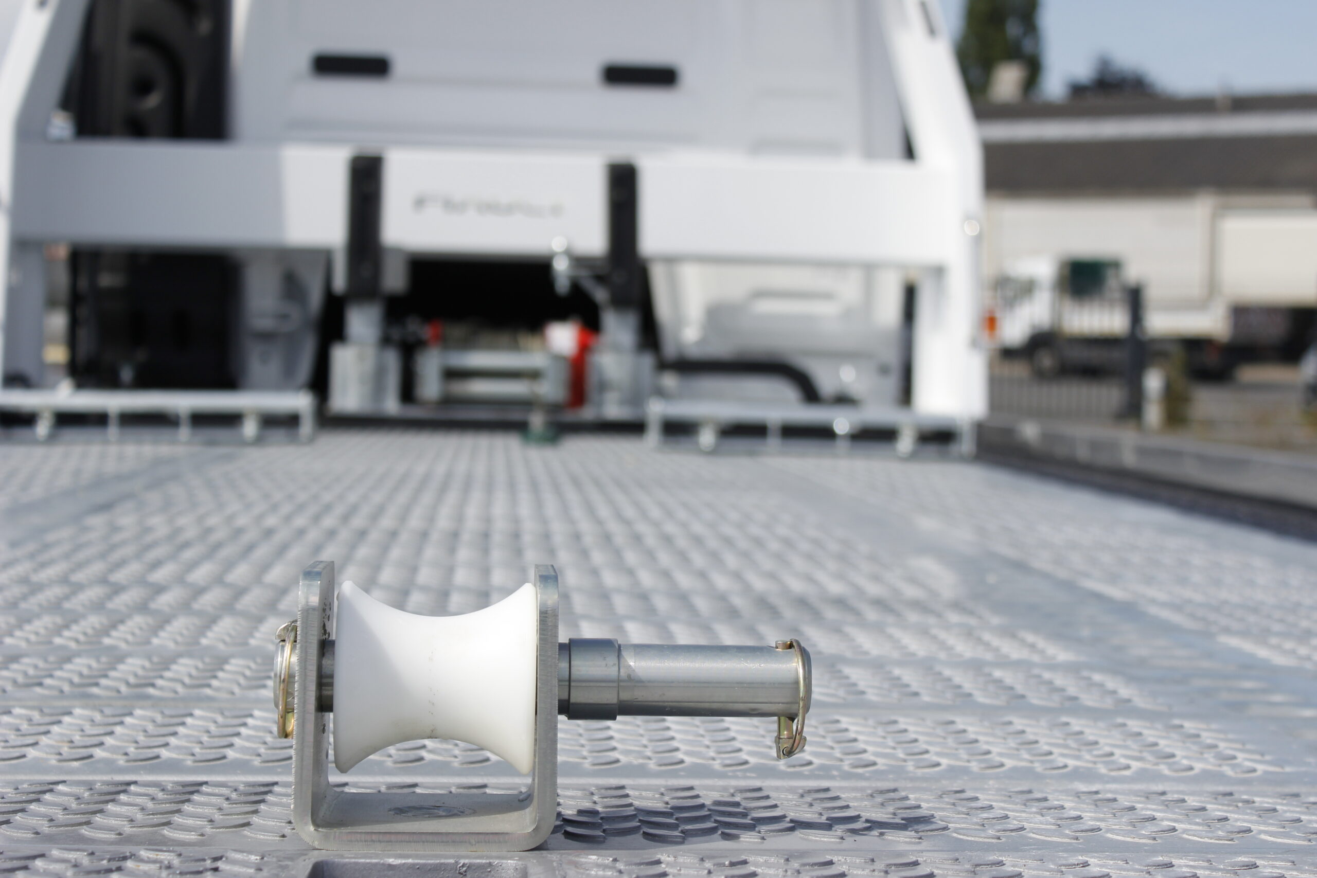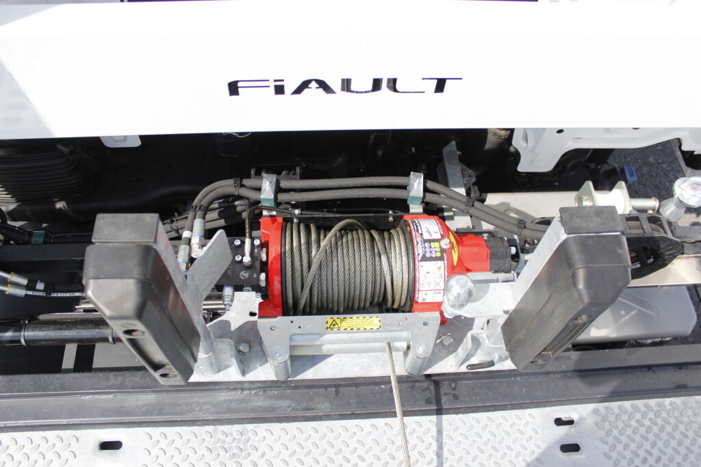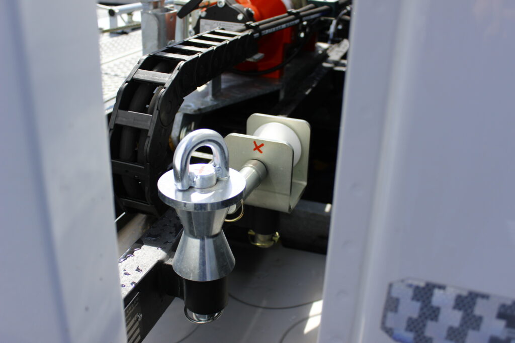 – Déplacement transversal hydraulique du treuil avec radio commande et deux butoirs amovibles avec crochet à boule diam. 50