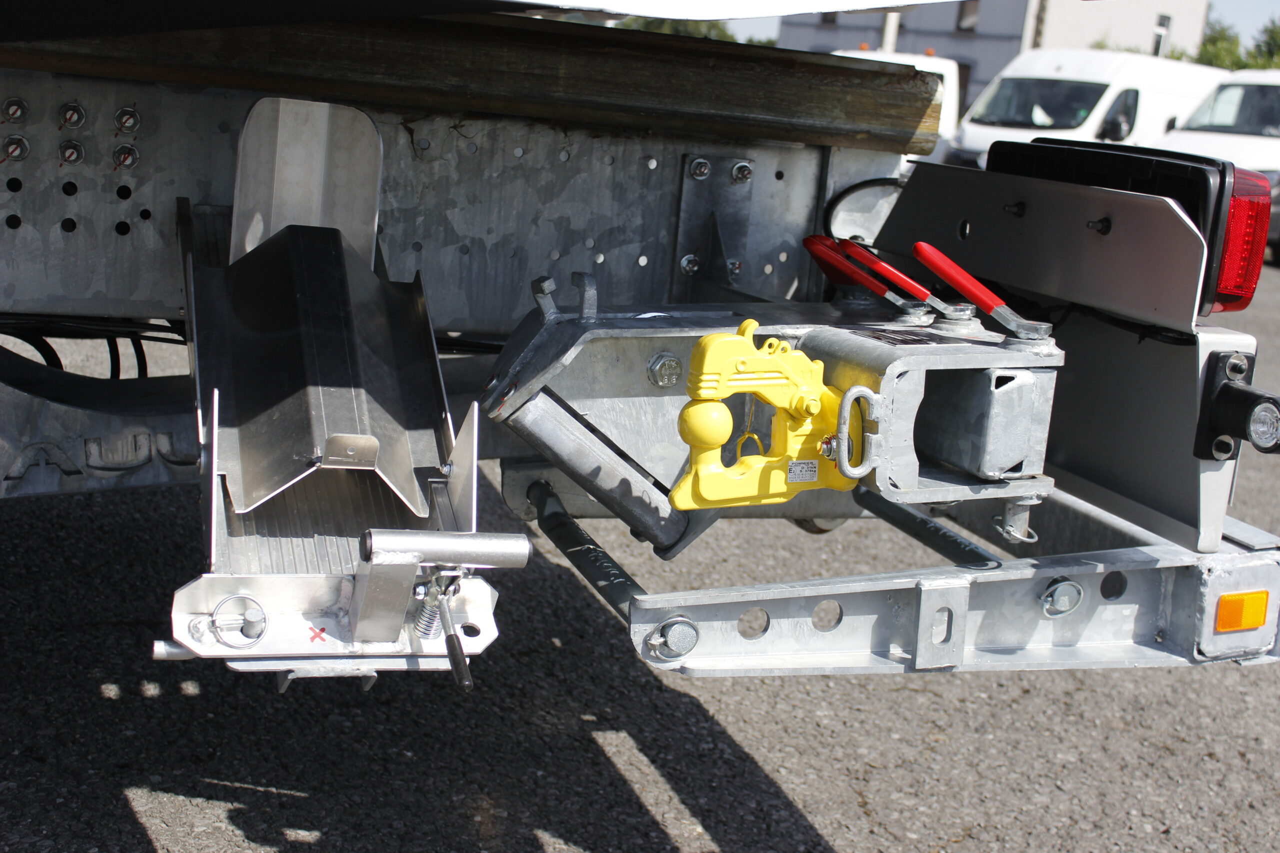 -Un combiné flèche-panier COMBILIFT 3T avec élévation hydraulique avec 2 vérins, extension hydraulique à 1200 mm, fourches de roues réglables en largeur, tête de grue avec poulie, rouleaux guide-câble et support, un crochet d’attelage double chape + boule adaptable sur la traverse du panier avec 2 broches, 2 sangles de roues (poids= 500 kg)