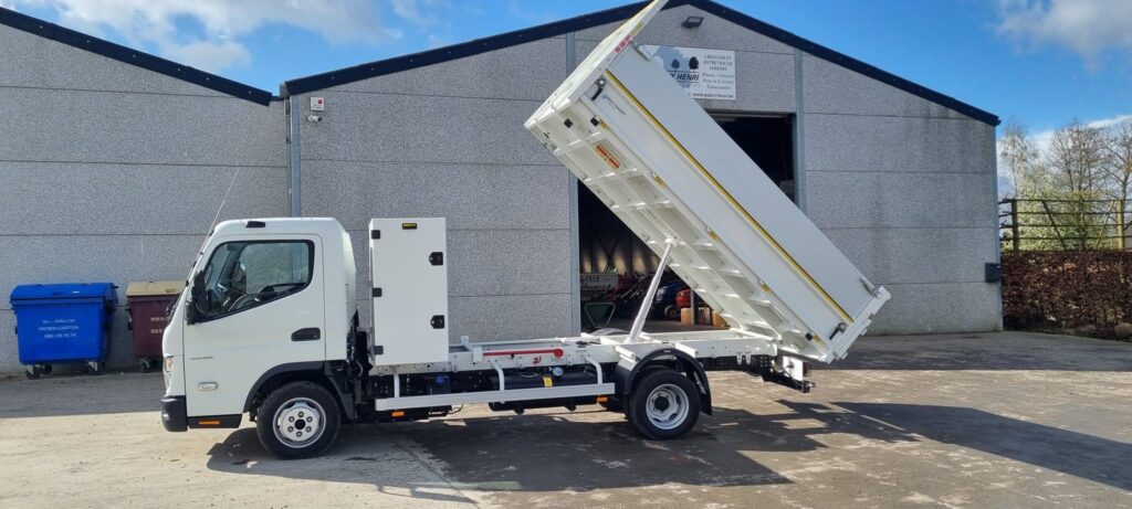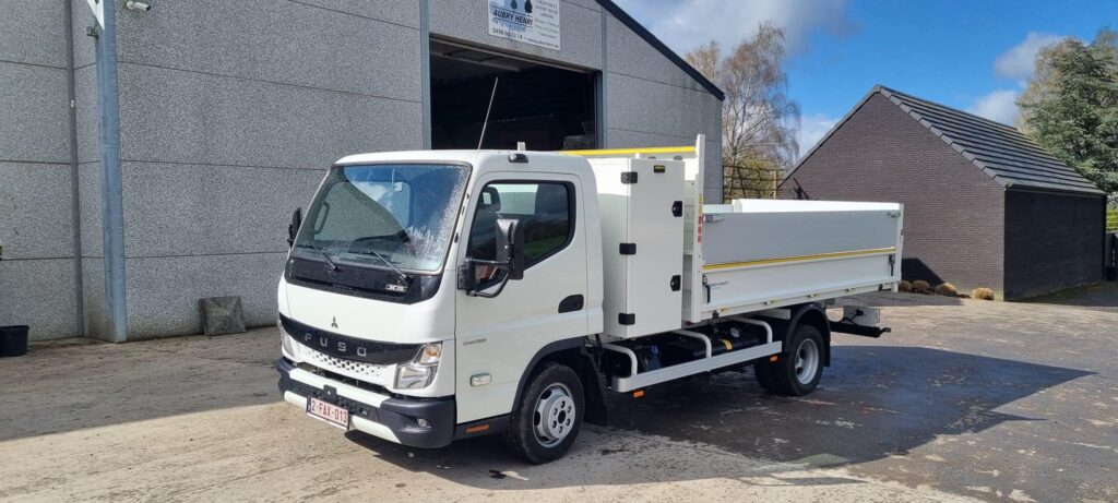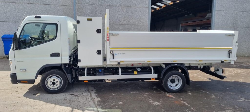 ✅ Montage d’une benne en acier sur FUSO Canter avec coffre en dos cabine.