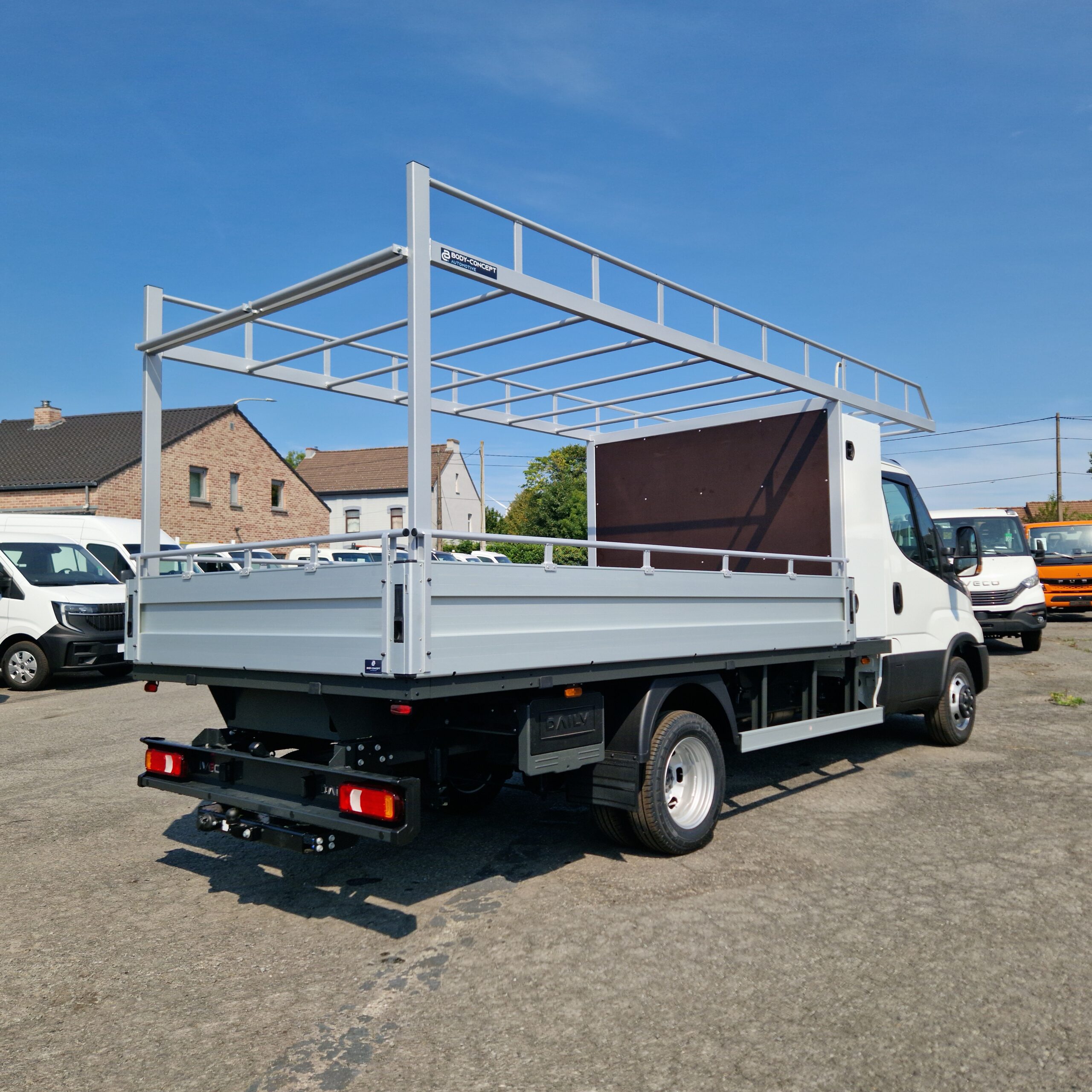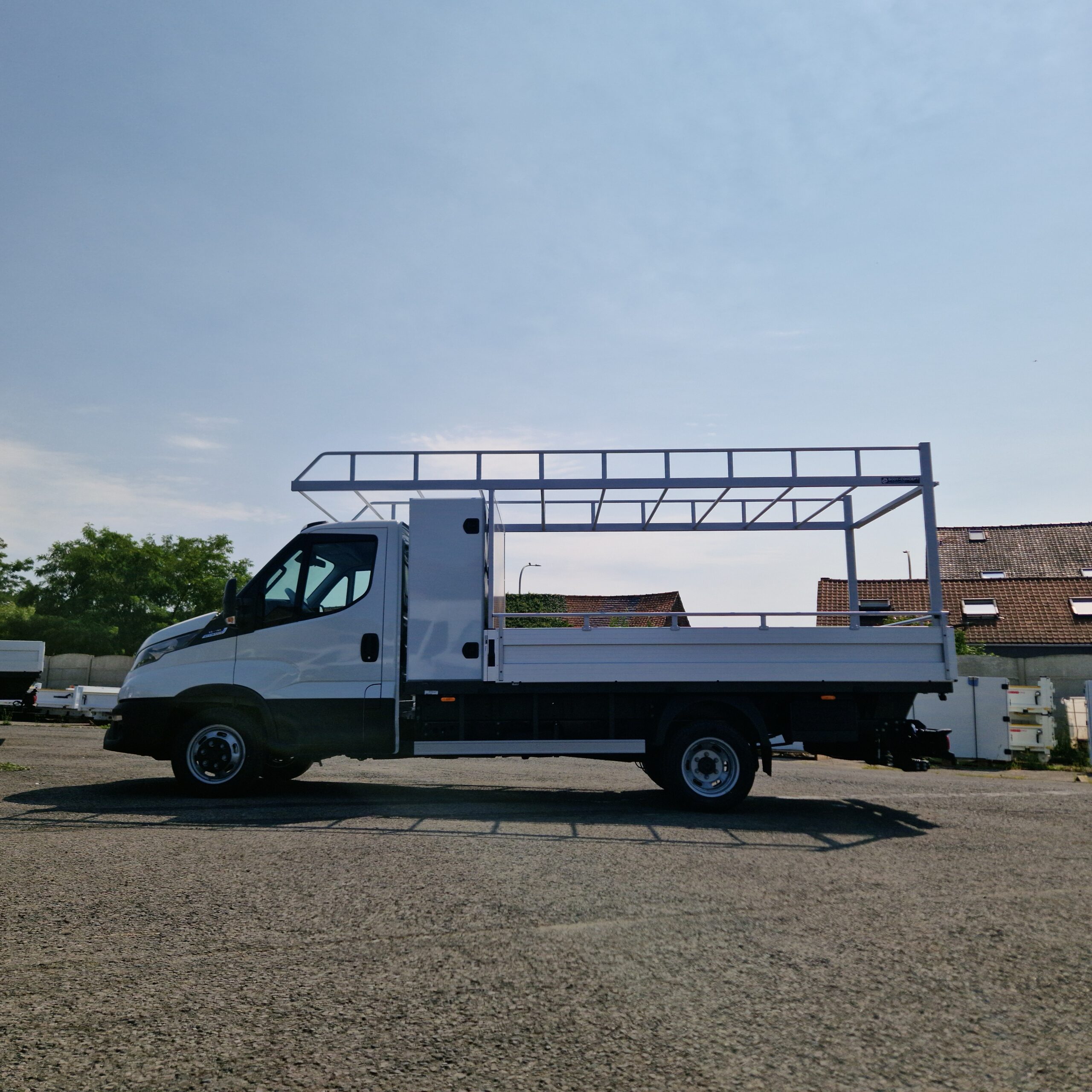 Pour un artisan couvreur, nous avons transformé un Iveco Daily plateau d’usine en véritable outil de travail. Objectif : transporter en sécurité échelles, panneaux et matériaux longs, tout en gardant un accès simple au chargement.