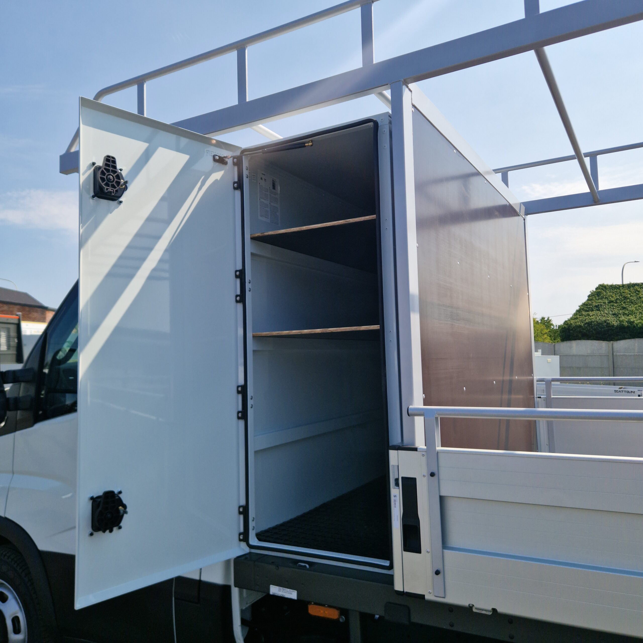 Le client souhaitait une structure robuste pour des charges encombrantes, un espace de rangement protégé pour l’outillage et des accès sécurisés au plateau, sans alourdir le véhicule ni gêner la manœuvrabilité.